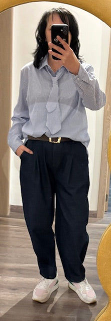 Overhemd/ blouse met blauw-witte strepen en (afneembare) das van TdS.